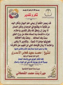 كرمت مديرة وحدة الحماية الاجتماعية بمنطقة عسير أمين عام جمعية البر بأبها الشيخ محمد بن فحاس لدعمه ومؤازرته العمل الاجتماعي الخيري على مستوى الأفراد والأسر والجهات ذات العلاقة .