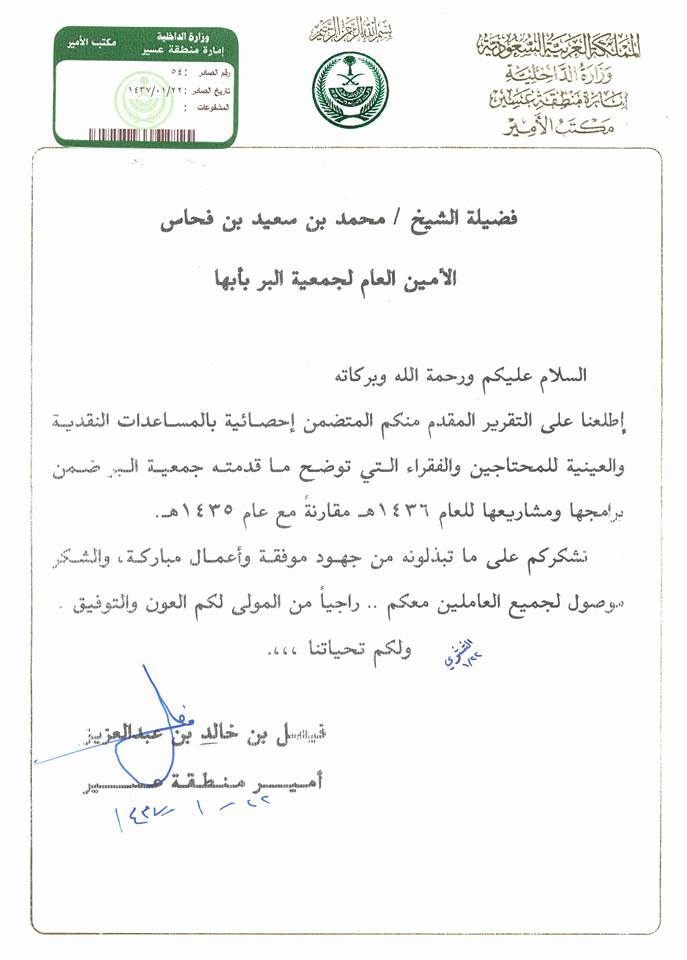 بعث صاحب السمو الملكي الأمير فيصل بن خالد بن عبدالعزيز آل سعود أمير منطقة عسير رئيس جمعية البر بأبها حفظه الله ، بخطاب شكر لأمين عام جمعية البر بأبها الشيخ محمد بن فحاس على جهوده الموفقة وأعماله المباركة وكذلك شكره لكافة العاملين بالجمعية بعد اطلاع سموه على التقرير السنوي الذي يوضح إحصائية المساعدات المقدمة خلال عام 1436هـ .