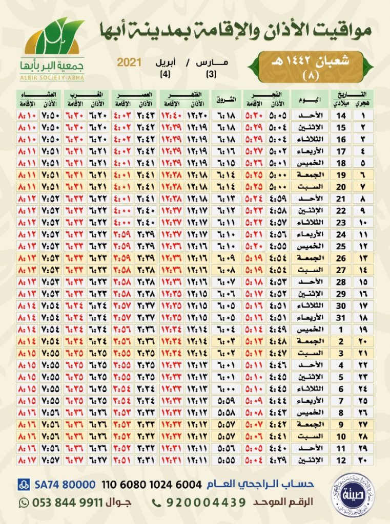 مواقيت الأذان والإقامة لشهر (شعبان) 1442هـ بمدينة أبها وضواحيها جمعية البر بأبها